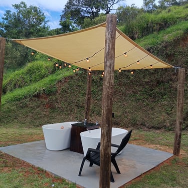 A suíte com banheira dupla tem uma decoração diferenciada, chaleira elétrica, duas cadeiras na área externa, uma varanda privativa maior e um pergolado com duas banheiras de imersão.