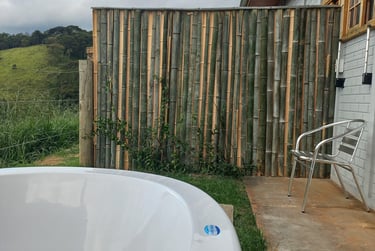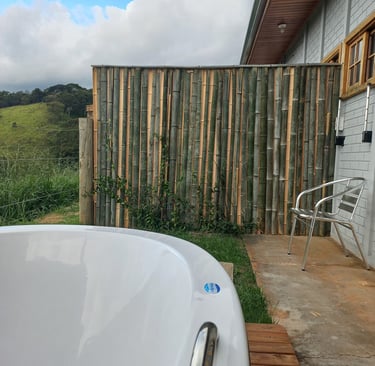 As suítes foram construídas de duas em duas, ou seja existe uma parede separando a suíte 3 da suíte 4, depois tem um vão livre de 2 metros ai tem a suíte 5 unida com a suíte 6, outro vão de 2 metros e a suíte 7 unida com a suíte 8. Para maior privacidade as varandas possuem uma parede fechada de bambú com 2 metros de altura.
