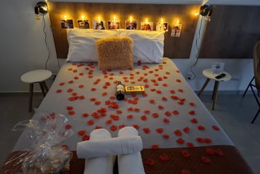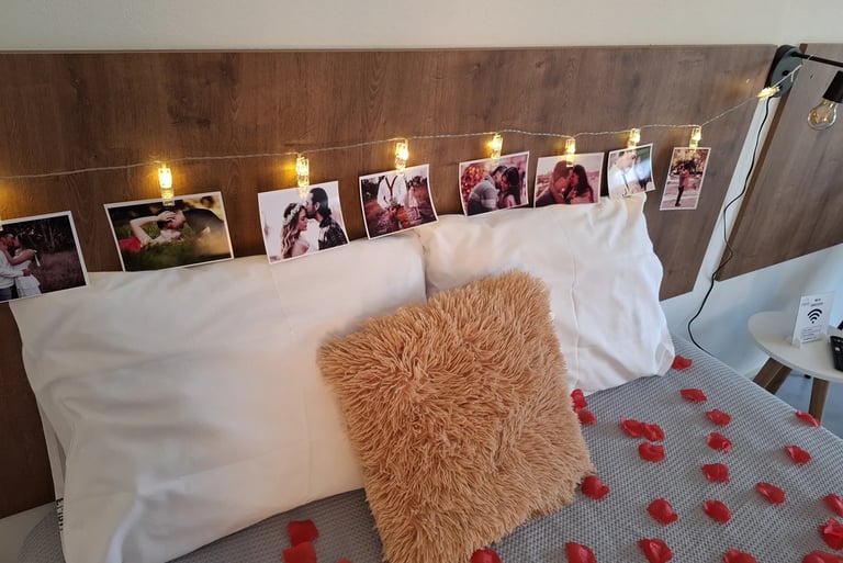 Oferecemos por um custo adicional a opção de decoração romântica. A decoração possui pétalas de rosas artificiais, varal de fotos iluminado, bombom de coco Rafaello ou bombom Ferrero Rocher acompanhado de vinho Chileno. O hóspede encaminha com pelo menos 5 dias de antecedência 8 fotos que serão impressas e colocadas no dia no varal de fotos. video_Kit_Romantico